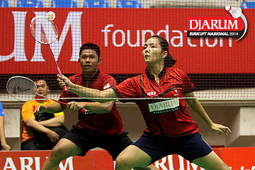 Andika Ramadiansyah/Mychelle Crhystine (DJARUM KUDUS) mengantisipasi arah datangnya shuttlecock