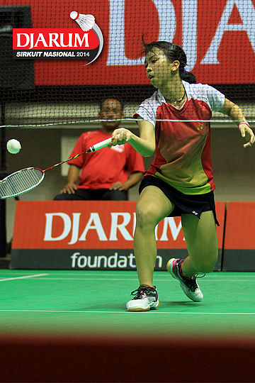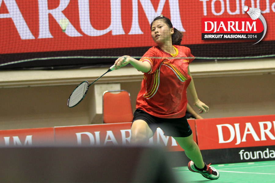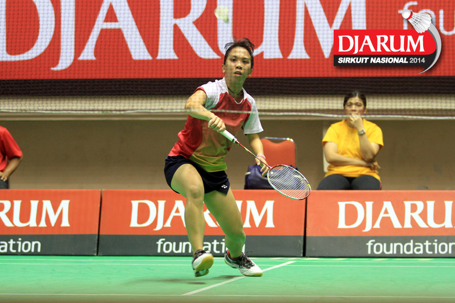 Devi Yunita Indah Sari (DJARUM KUDUS) mengembalikan shuttlecock ke arah Mia Mawarti Utami (GUNA DHARMA)