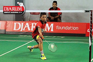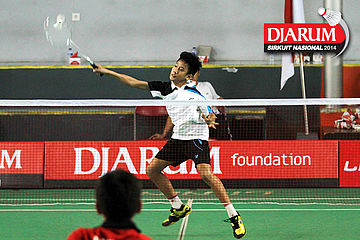 Armas Nafinium (Jaya Raya Metland) mengembalikan shuttlecock ke arah Galuh Dwi Putra (Candra Wijaya)