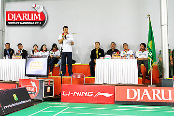 Ketua pelaksana Djarum Sirkuit Nasional Li-Ning Banten Open 2014, Tubagus Budi Darmawan saat memberikan sambutan pada upacara pembukaan di GOR ASA Sport Centre, Cilegon