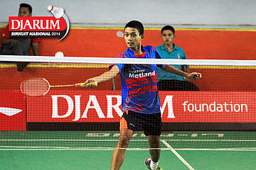 Nijynsco Kaleb (Candra Wijaya) mengembalikan shuttlecock ke arah Daniel Ari Wibisono (Sarwendah)