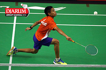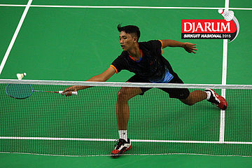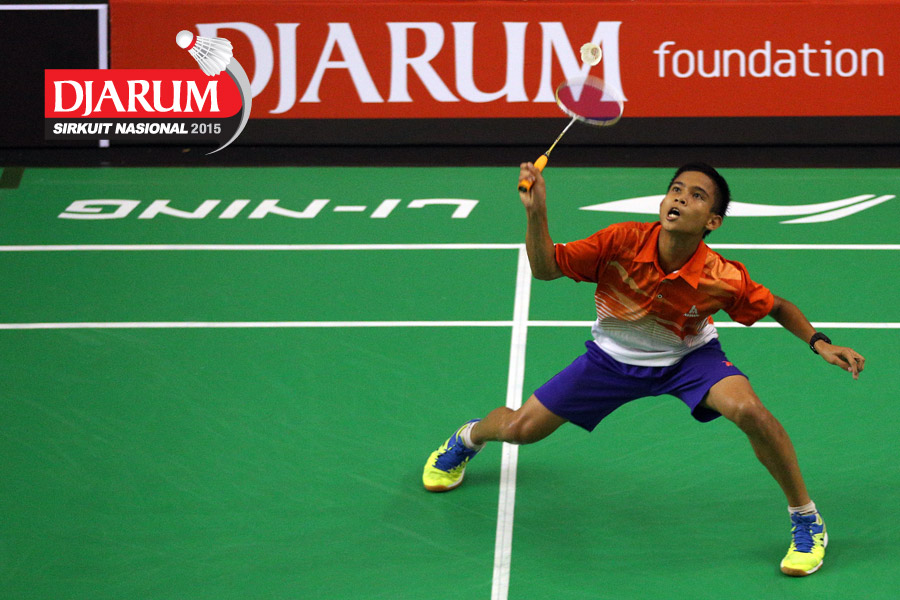 Hilmi Nasarullah (Pelita Bakrie) mengembalikan shuttlecock ke arah Faiz Bin Rozain (Terengganu Malaysia).