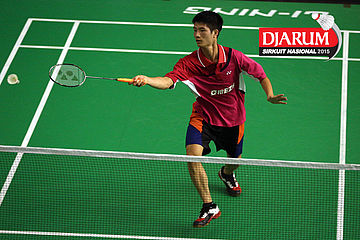 M. Rizki Putra (Candra Wijaya) berusaha menggapai pengembalian dari Kou Hou Chun (China Taipei).
