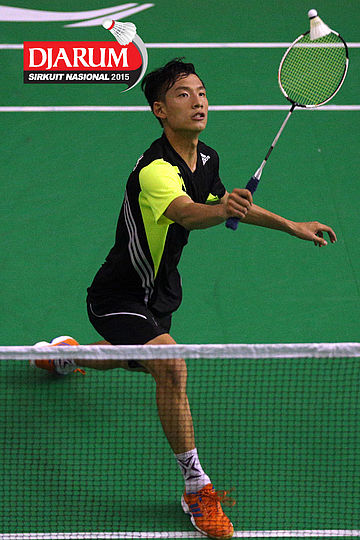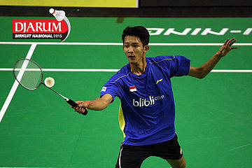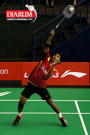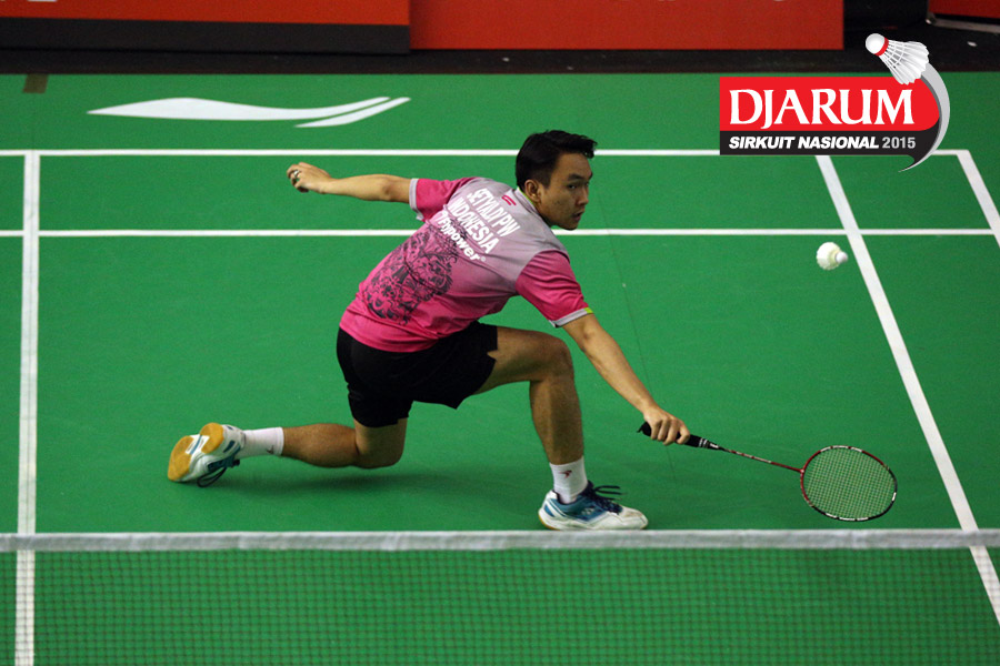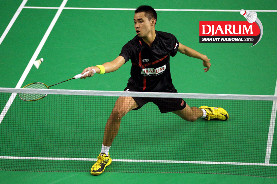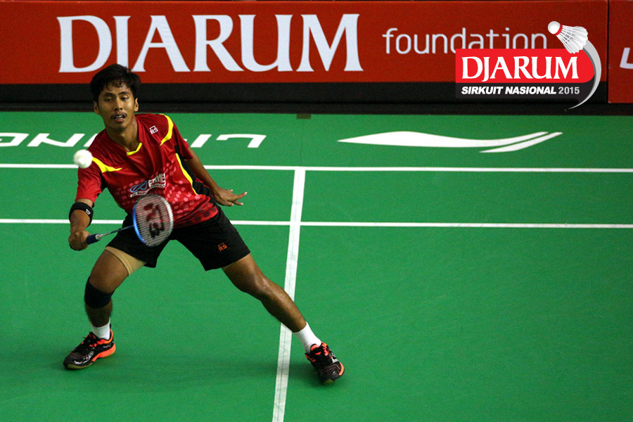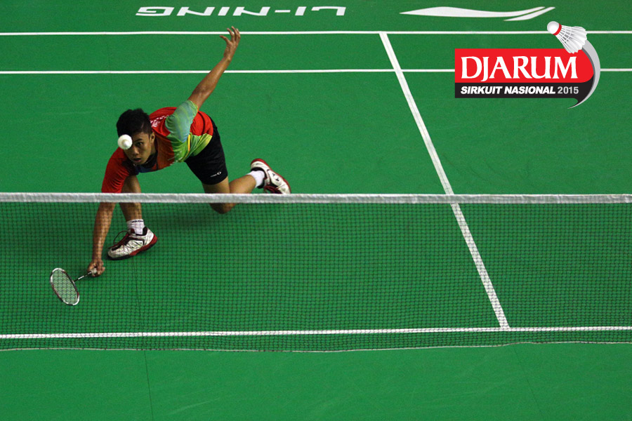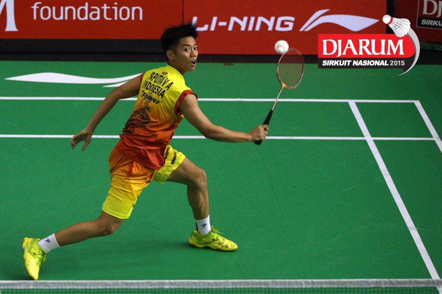 Kho Henrikho (Djarum Kudus) mengembalikan shuttlecock ke arah Muhammad Yunus (Guna Dharma).