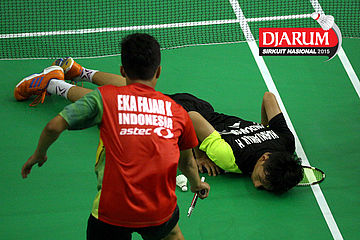R. Eka Fajar (Jaya Raya) mengembalikan shuttlecock ke arah Hardianto Kurniawan (Tangkas).