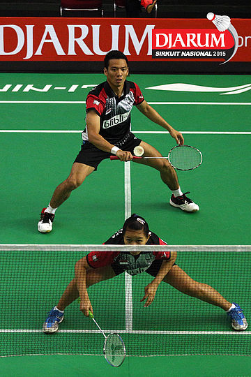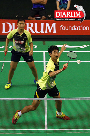 Ardiansyah Putra/Devi Tika Permatasari (Berkat Abdadi) berusaha menggapai pengembalian dari M. Rijal/Shendy Puspa (Djarum Kudus).