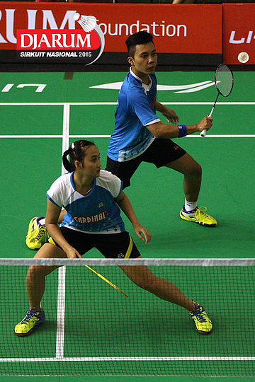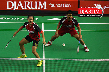 M. Robi Darwis/Monika Insany (Mutiara Cardinal) bersiap menyambut pengembalian dari Akbar Gusti/Serena Kani (Djarum Kudus).