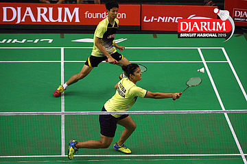 M. Rijal/Shendy Puspa (Djarum Kudus) menyambut pengembalian dari Ardiansyah Putra/Devi Tika Permatasari (Berkat Abdadi).