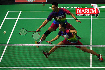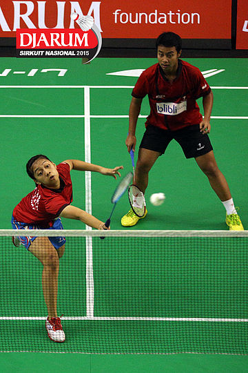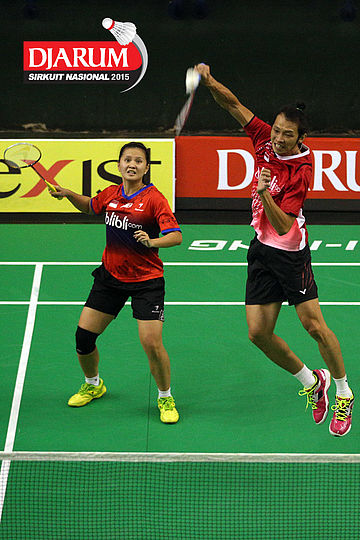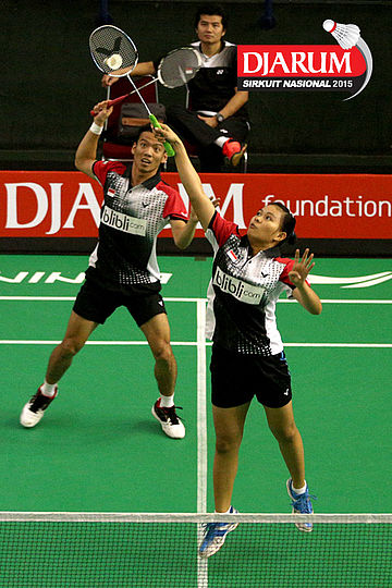 Fran Kurniawan/Komala Dewi (Djarum Kudus) melepaskan smash ke arah Irfan Fadillah/Pia Zebadiah (Jaya Raya).
