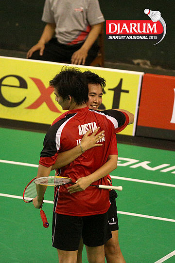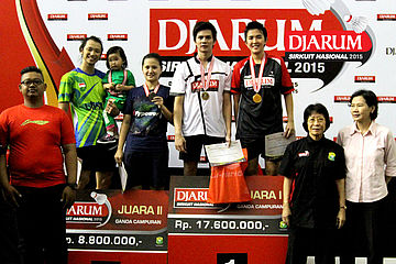 Andrei Adistia/Vita Marissa (Djarum Kudus) saling berpelukan setelah memastikan diri sebagai juara di Ganda Campuran Dewasa Djarum Sirkuit Nasional Li Ning Jakarta Open 2015.