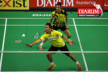 Fran Kurniawan/Trikususma Wardhana (Djarum Kudus/Suryanaga) mengembalikan shuttlecock ke arah Irfan Fadillah/Markis Kido (Jaya Raya).