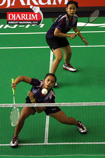Dian Fitriani/Nadya Melati (Pertamina Fastron) mengembalikan shuttlecock ke arah Meirisa Cindy/Nisak Puji (Pelatnas).
