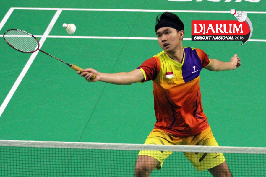 Alamsyah Yunus (JR Enkei) mengembalikan shuttlecock ke arah Setyaldi Putra (Guna Dharma).