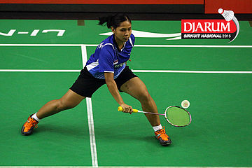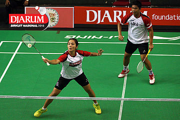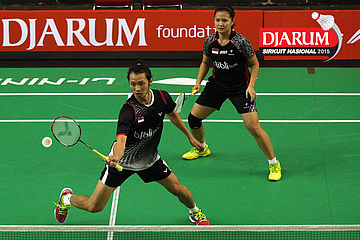 Fran Kurniawan/Komala Dewi (Djarum Kudus) menyambut pengembalian dari Andrei Adistia/Vita Marissa (Djarum Kudus).