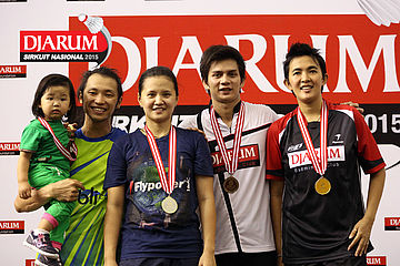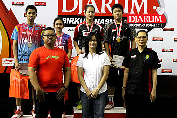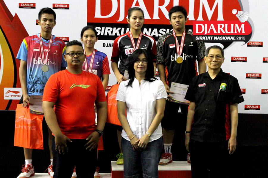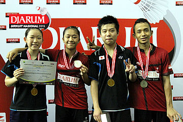 Mahiro Kaneko/Sebun Nagai (Tomioka Jepang) dan M. Taufiqul/Vanadia Pranasa (Djarum Kudus) berfoto bersama usai naik podium.
