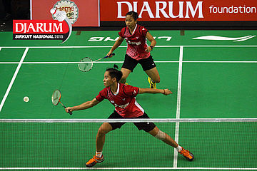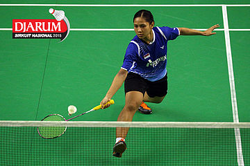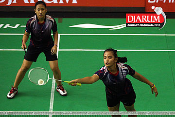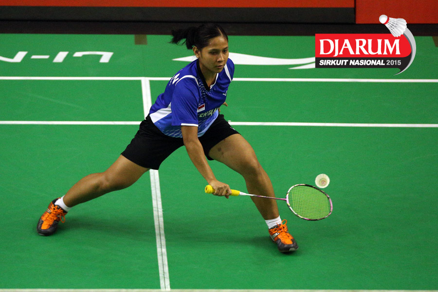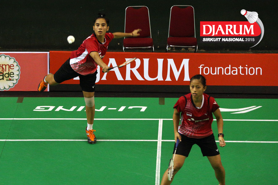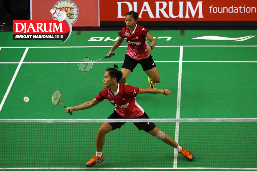 Dian Fitriani/Nadya Melati (Pertamina Fastron) mengembalikan shuttlecock ke arah Meirisa Cindy/Nisak Puji (Pelatnas).