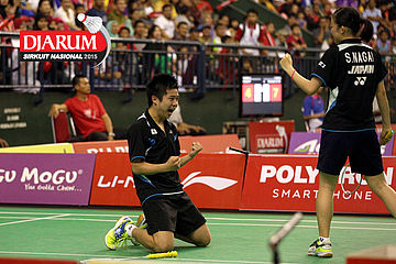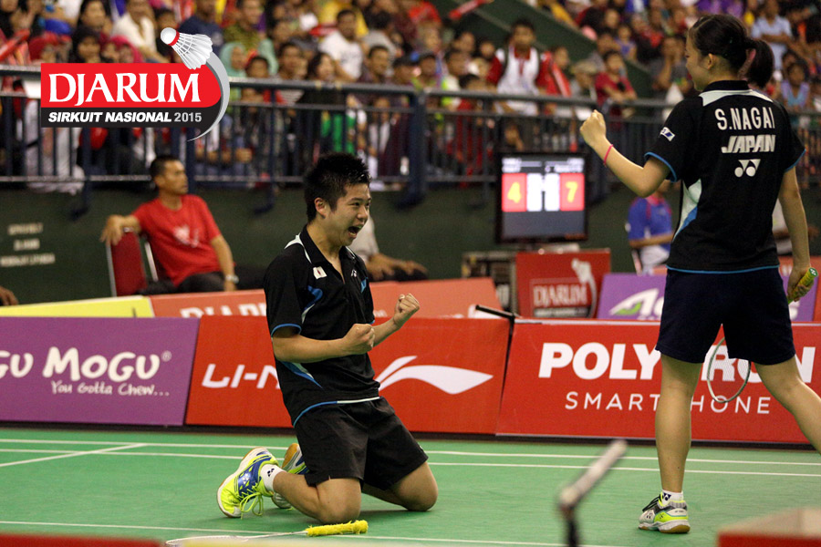 Selebrasi Mahiro Kaneko/Sebun Nagai (Tomioka Jepang) setelah berhasil memenangkan pertandingan atas M. Taufiqul/Vanadia Pranasa (Djarum Kudus).