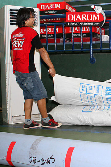 Seorang pekerja saat menuangkan cairan perekat untuk keperluan dekorasi pelaksanaan Djarum Sirkuit Nasional Li-Ning Jakarta Open 2014 di GOR Asia Afrika, Jakarta