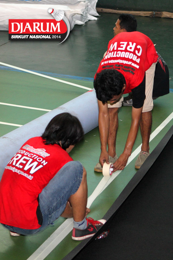 Dua pekerja saat membuka gulungan karpet pertandingan