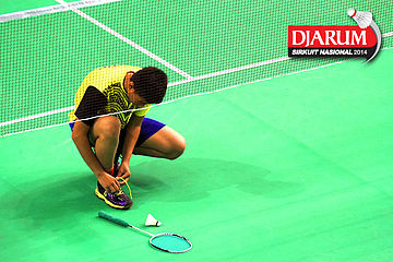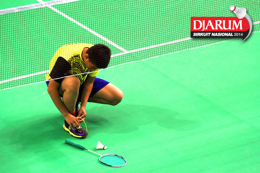 M. Wisang Geni (Jakarta BC) saat mengikat tali sepatunya yang lepas