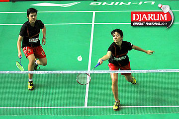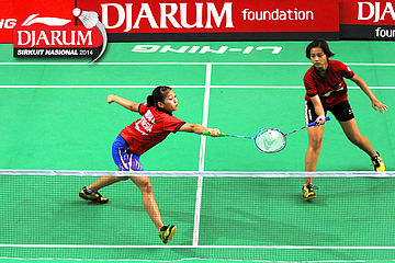 Rona Novianti/Sinta Safitri (Mutiara Bandung) mengembalikan shuttlecock ke arah Mauri Lialitasari/Sintya Dewi (Pelita Bakrie)