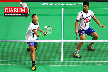 Ghiyats Afif/Stefanus Christian (PB Djarum) bersiap menghadang pengembalian dari M. Agus/Ricardo P. Liu (Exist)