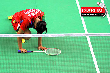 Salma Nuha (PPLP DKI Jakarta) harus terjatuh saat berusaha mengembalikan shuttlecock