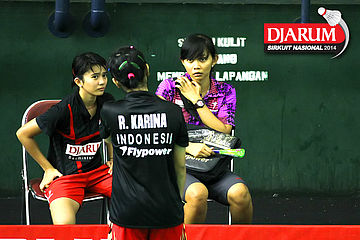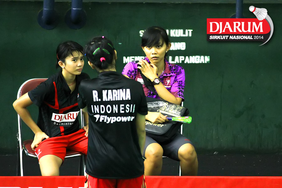 Maria Kristine (kanan) saat memberikan masukan kepada Aldika Fanisha Gea/Karina Ria (PB Djarum) usai bertanding