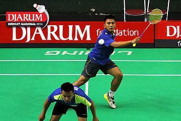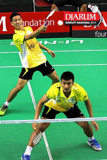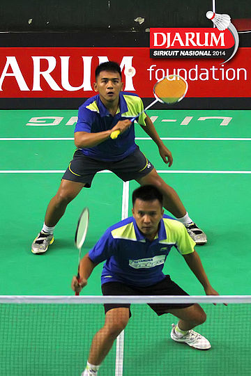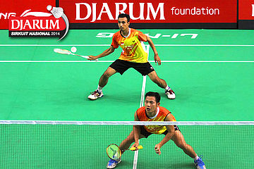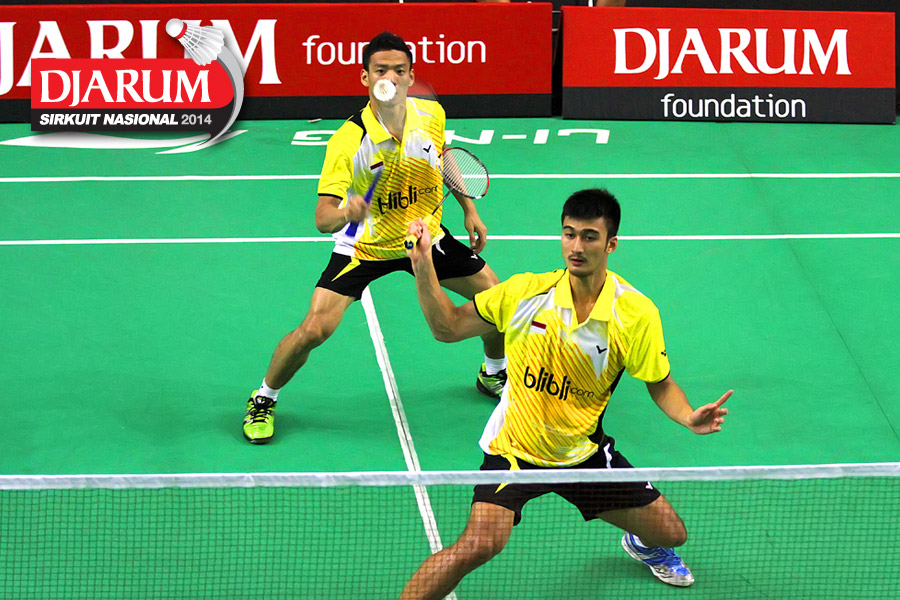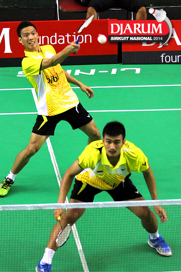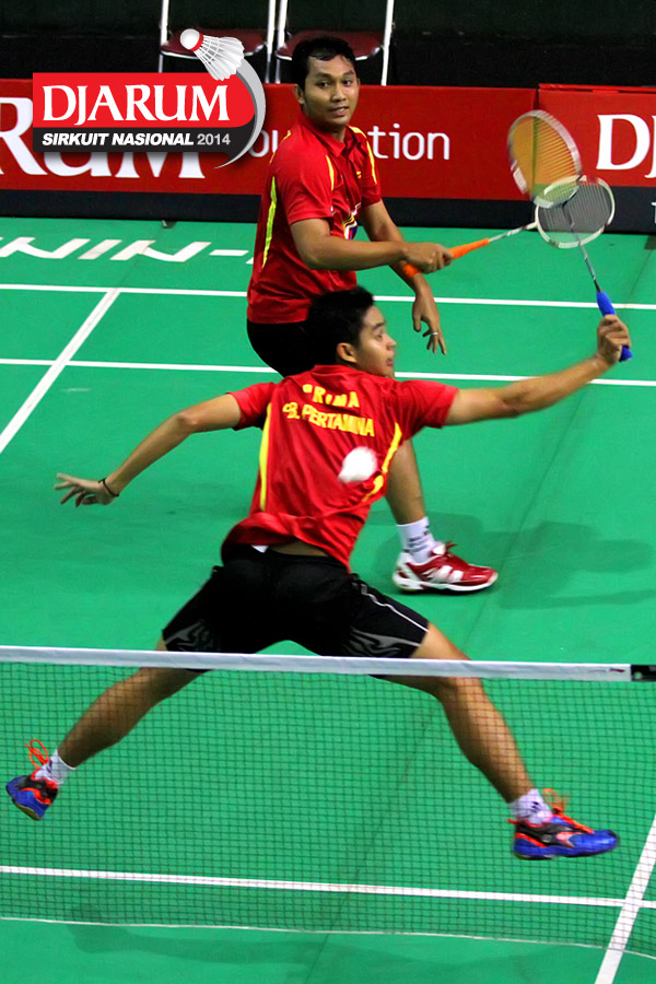 Lukhi Apri/Rafiddias Akhdan (Pelatnas) menghadang serangan yang dilepaskan Anggun Nugroho/Rio Wilianto (Halim/JR Enkei)
