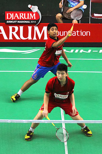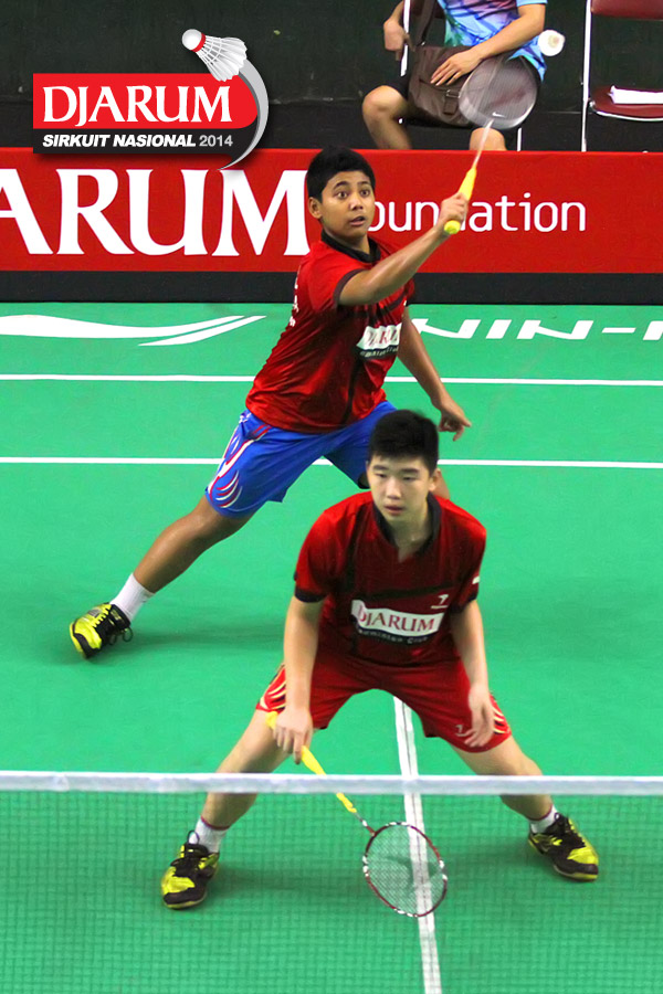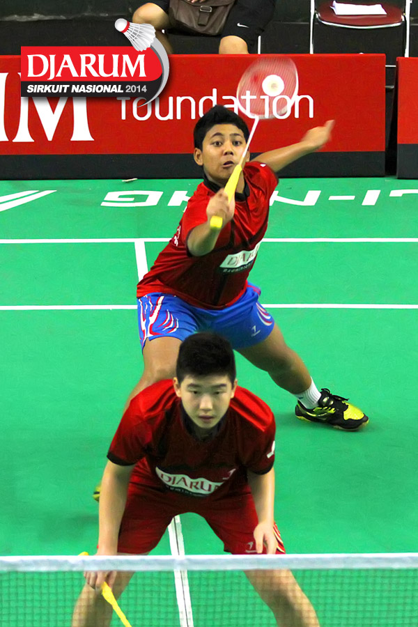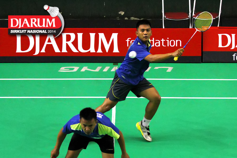 Anggun Nugroho/Rio Wilianto (Halim/JR Enkei) mengembalikan shuttlecock ke arah Lukhi Apri/Rafiddias Akhdan (Pelatnas)