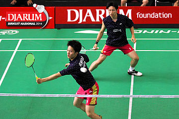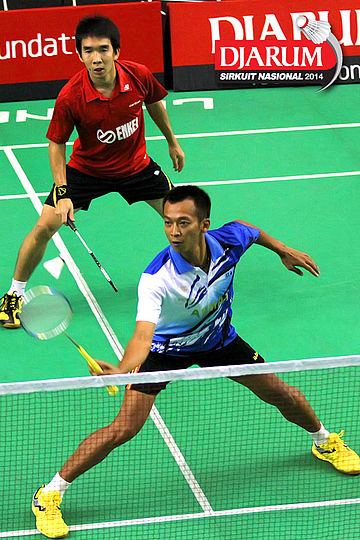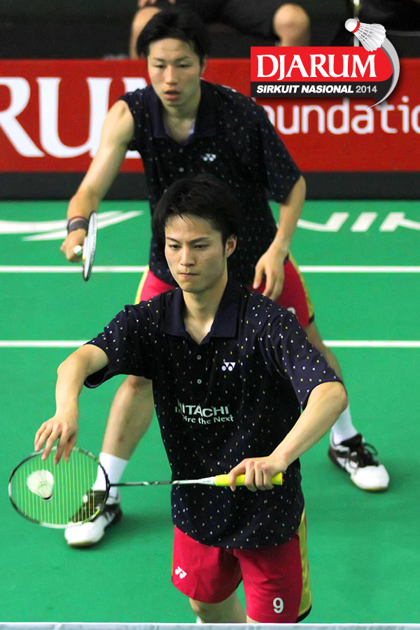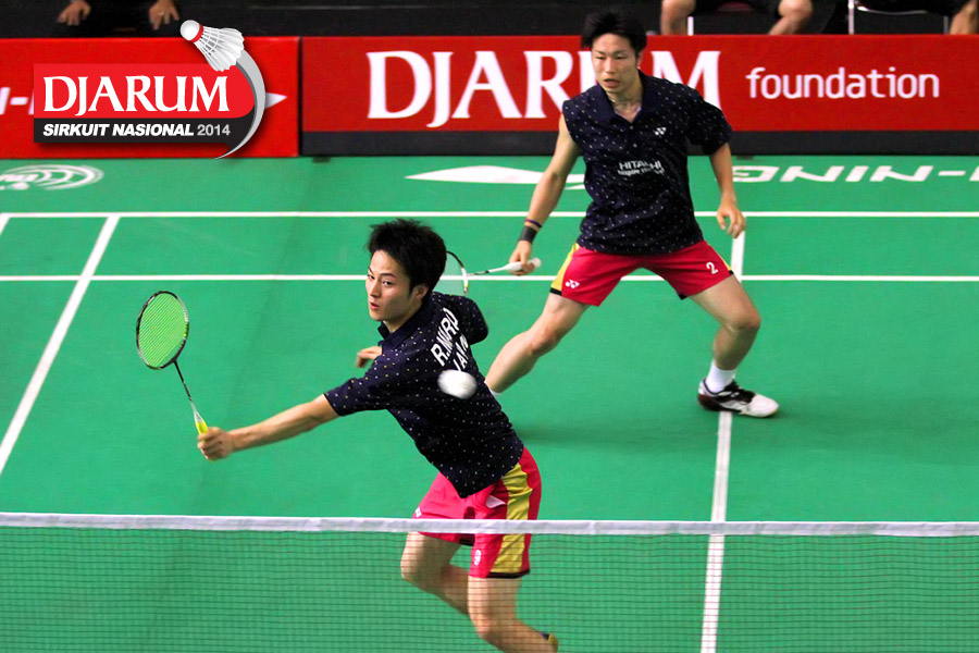 Koji Naito/Ryotaro Mauro (Jepang) mengembalikan shuttlecock ke arah Arianto/Ridho (JR Enkei)