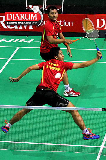 Danu Wandani/Indra Setiawan (Pertamina Indonesia) mengembalikan shuttlecock ke arah Rifky Faturrahman/Subhan Hasan (Jaya Raya)