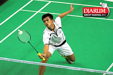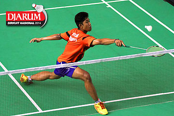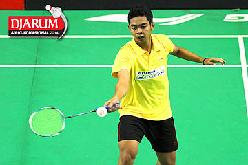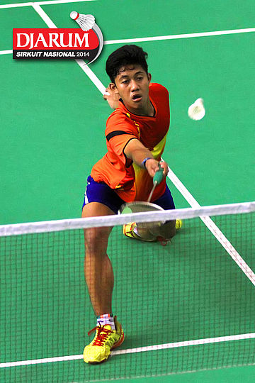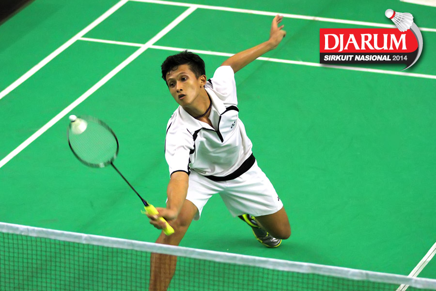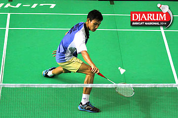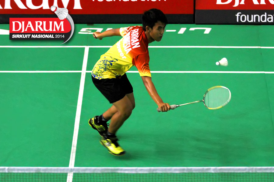 M. Fahri (Harapan Jaya) mengembalikan shuttlecock ke arah M. Farhan (Mentari V Kool)