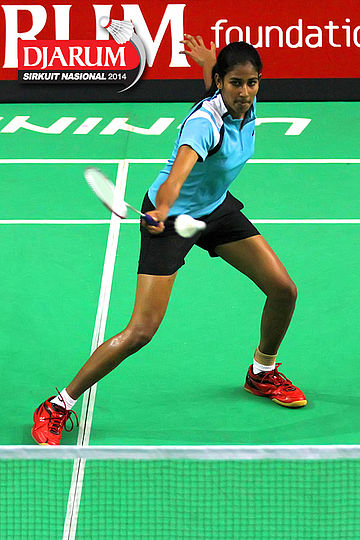 Sandra Rahayu (Sarwendah) mengembalikan shuttlecock ke arah Aditi Anand (India)