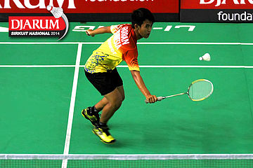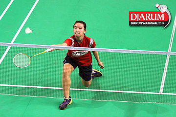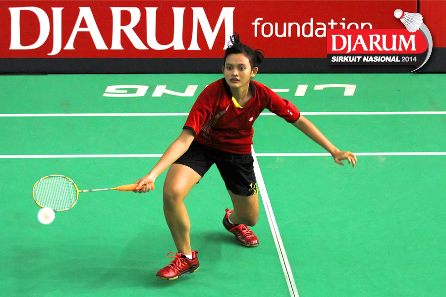 Zulfikar Aziz (SGS PLN) mengembalikan shuttlecock ke arah Prima Khasna (Pertamina Indonesia)