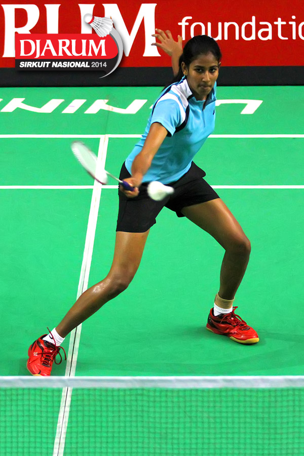 Aditi Anand (India) mengembalikan shuttlecock ke arah Sandra Rahayu (Sarwendah)