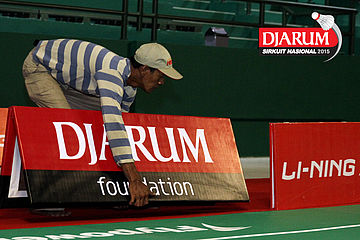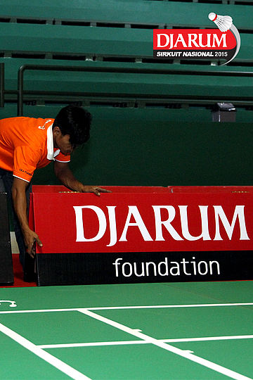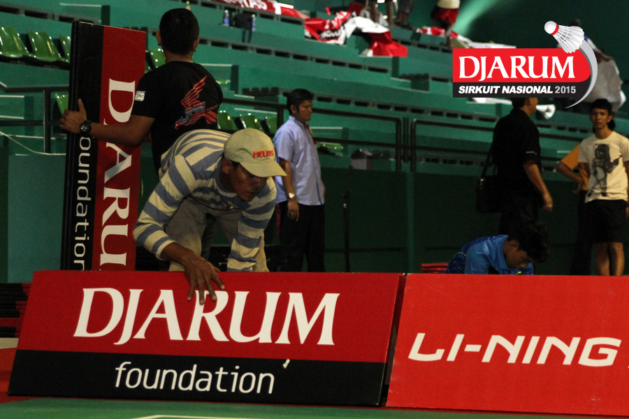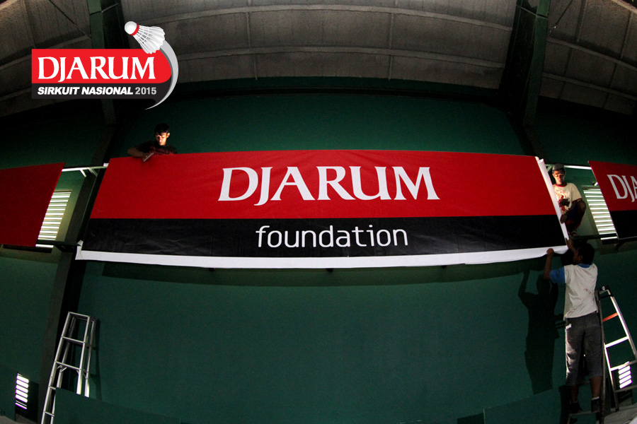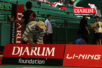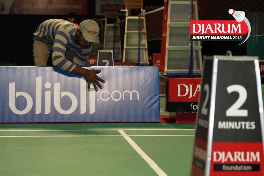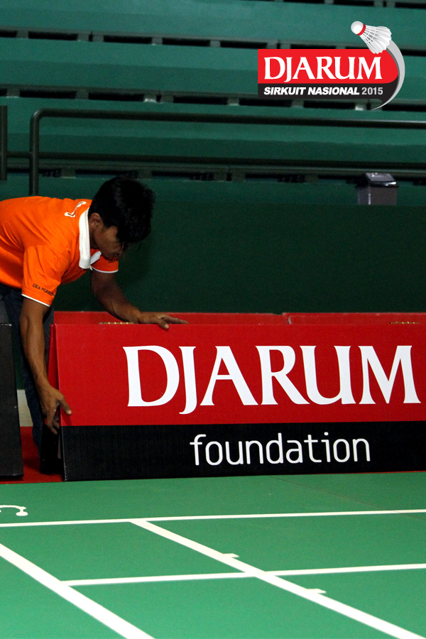 Salah satu pekerja memasang ads board Djarum Foundation.
