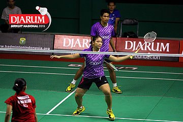 Panji Akbar/Apriyani Rahayu (Pelita Bakrie) melepaskan serangan.