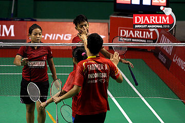 Galang Decky/Cynthia Shara (Djarum Kudus) bersalaman usai bertanding.