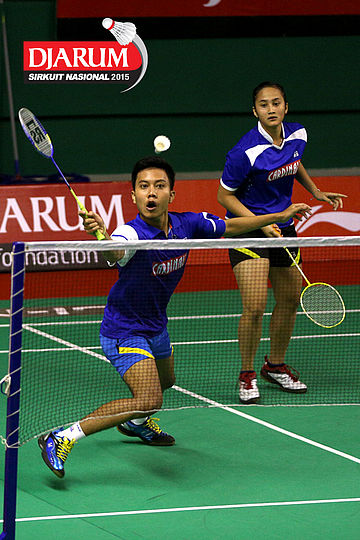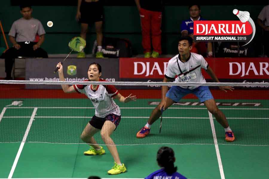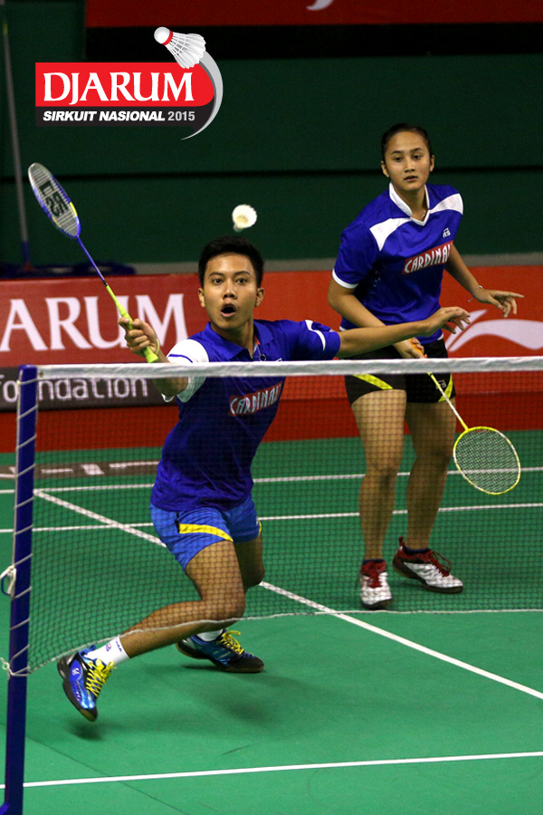 Afiat Yuris/Nadya Melati (Pertamina Fastron) bersiap menggapai shuttlecock.