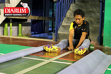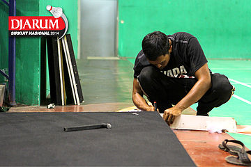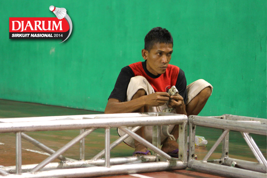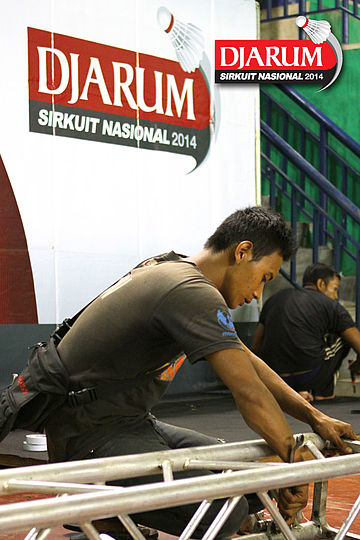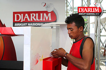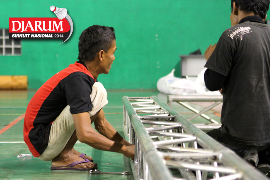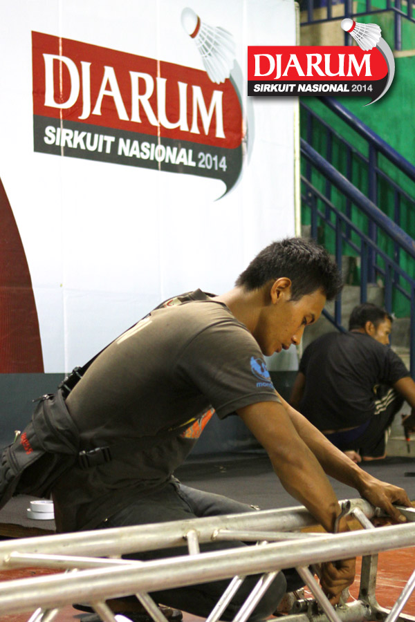 Seorang pekerja saat memasangkan material dekorasi Djarum Sirkuit Nasional Li-Ning Jabar Open 2014