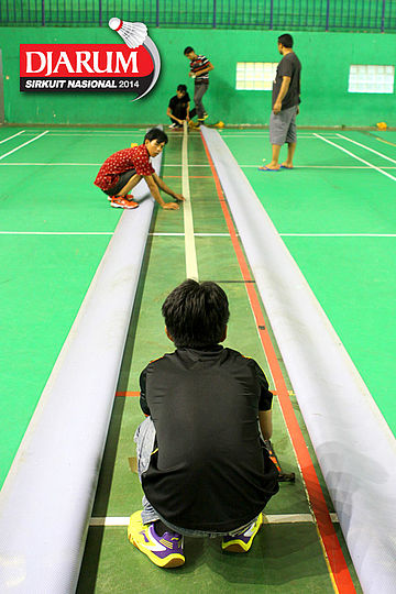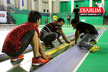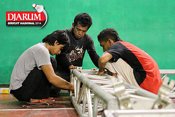 Tiga orang saat memasangkan material dekorasi Djarum Sirkuit Nasional Li-Ning Jabar Open 2014