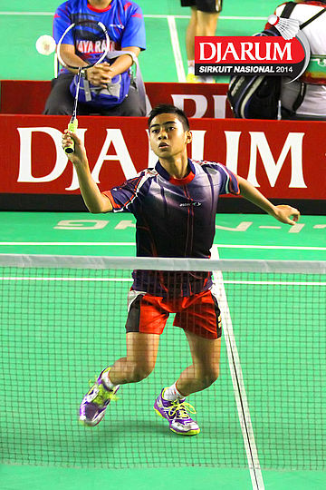 Andi Fadel (Jaya Raya) bersiap menyambar pengembalian tanggung dari Calvin Ryan Mamoto (PB Djarum)