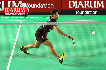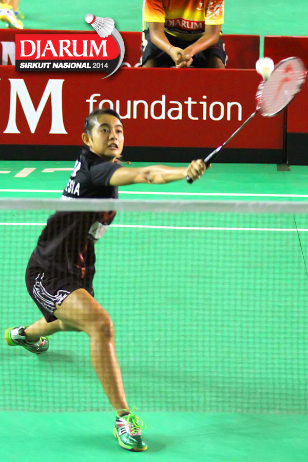 Agdevika Rochmadhani (PB Djarum) bersiap menyambar pengembalian dari Virny Putri (Jaya Raya)
