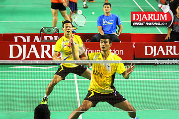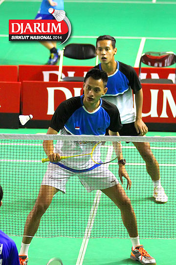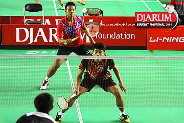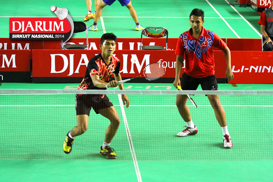 Lukhi Apri/Rafiddias Akhdan (Pelatnas) bersiap menyambar pengembalian tanggung dari M. Nur Rofii/Subhan Hasan (Jaya Raya/Bank Sumsel)