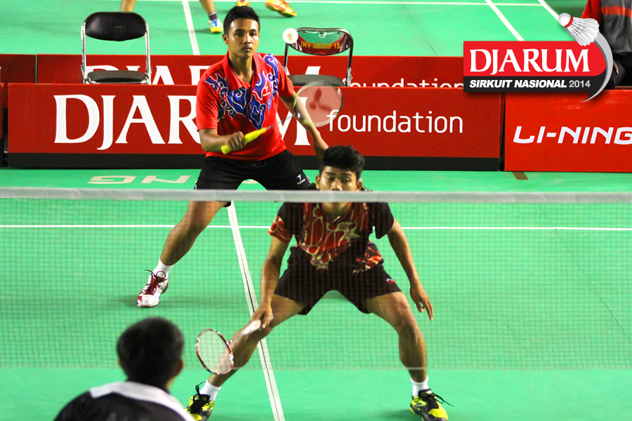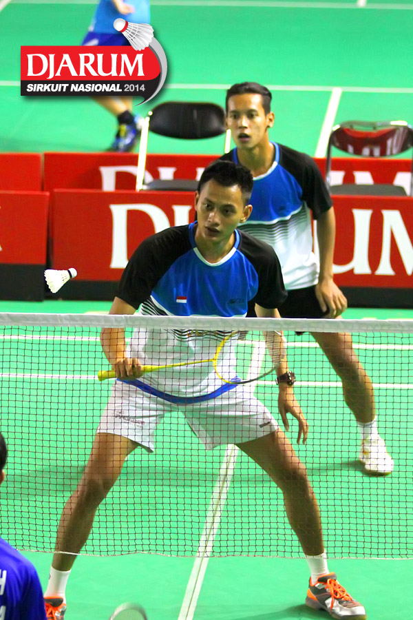 Deni S/Nugroho Andi (JR Enkei) bersiap menyambut pengembalian dari Ryan Sauqi/Stevan Indra (Mutiara Bandung)