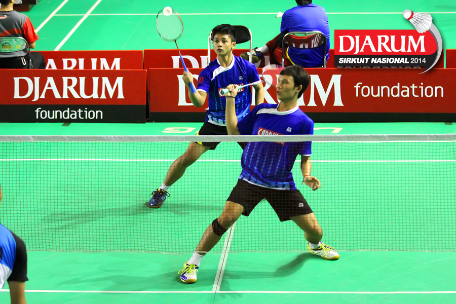 Deni S/Nugroho Andi (JR Enkei) bersiap menyambar pengembalian dari Ryan Sauqi/Stevan Indra (Mutiara Bandung)