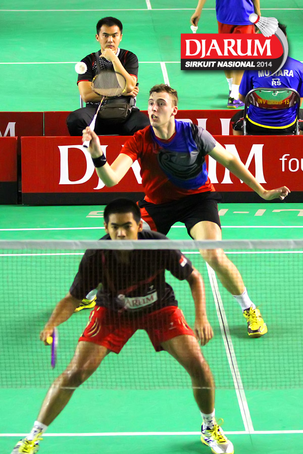 Andi Fadel (Jaya Raya) bersiap mengembalikan shuttlecock ke arah Calvin Ryan Mamoto (PB Djarum)