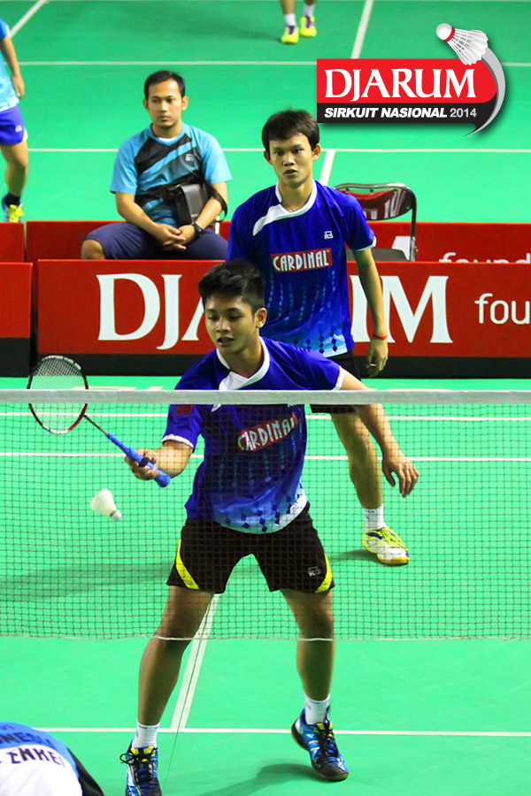 Ryan Sauqi/Stevan Indra (Mutiara Bandung) mengembalikan shuttlecock ke arah Deni S/Nugroho Andi (JR Enkei)