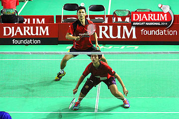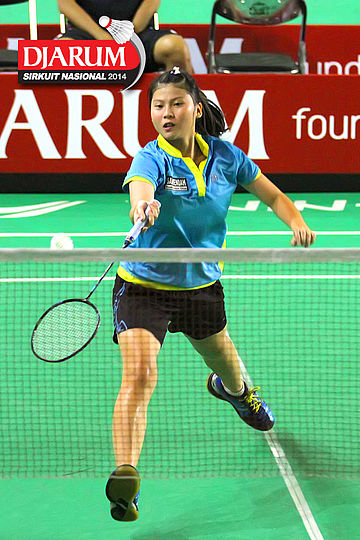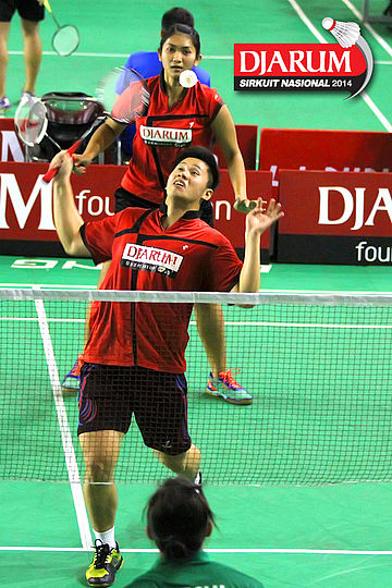Hantoro/Deariska Putri (PB Djarum) bersiap menyambar pengembalian tanggung dari Ikhsan Adam/Uzchi Ananda (Guna Dharma)